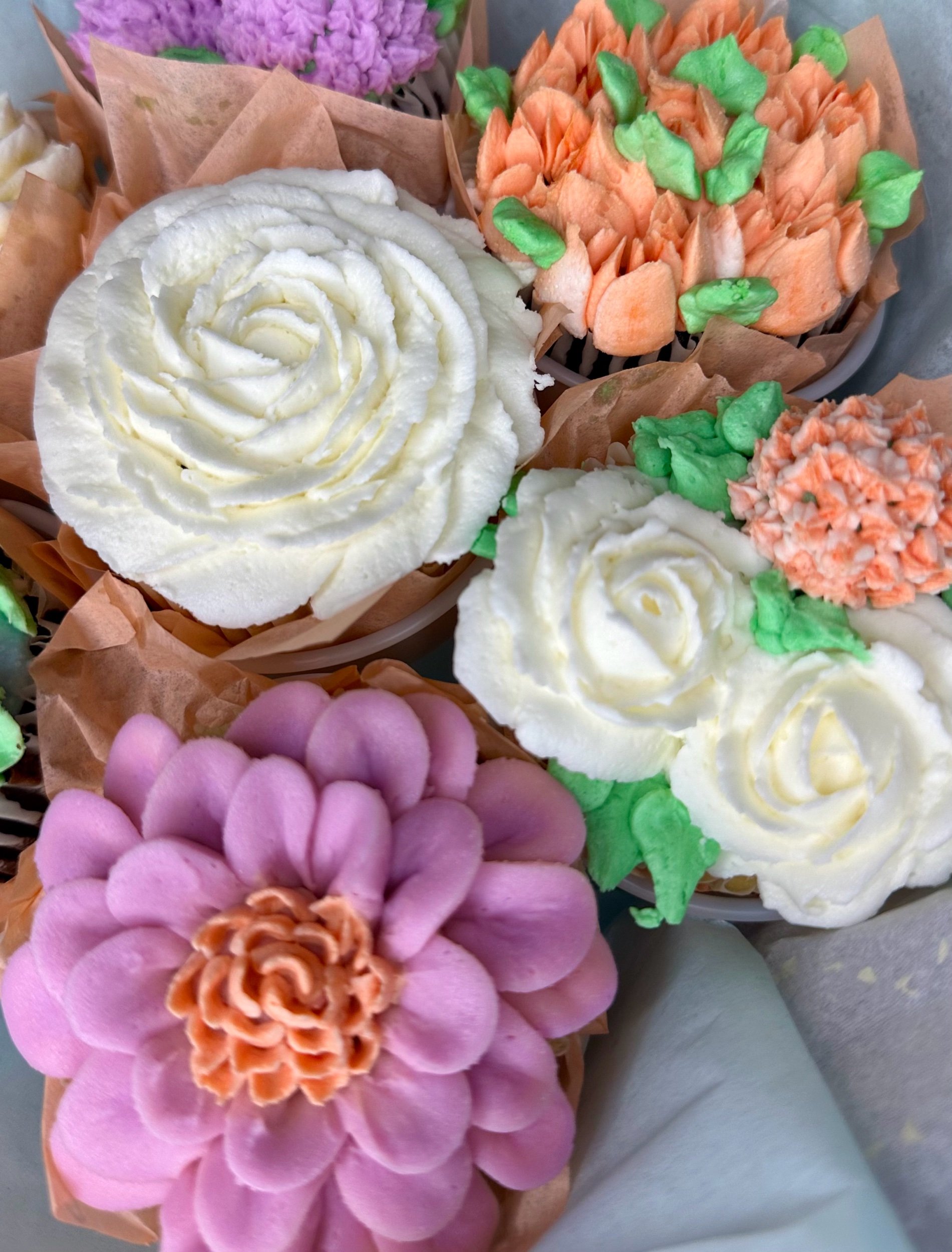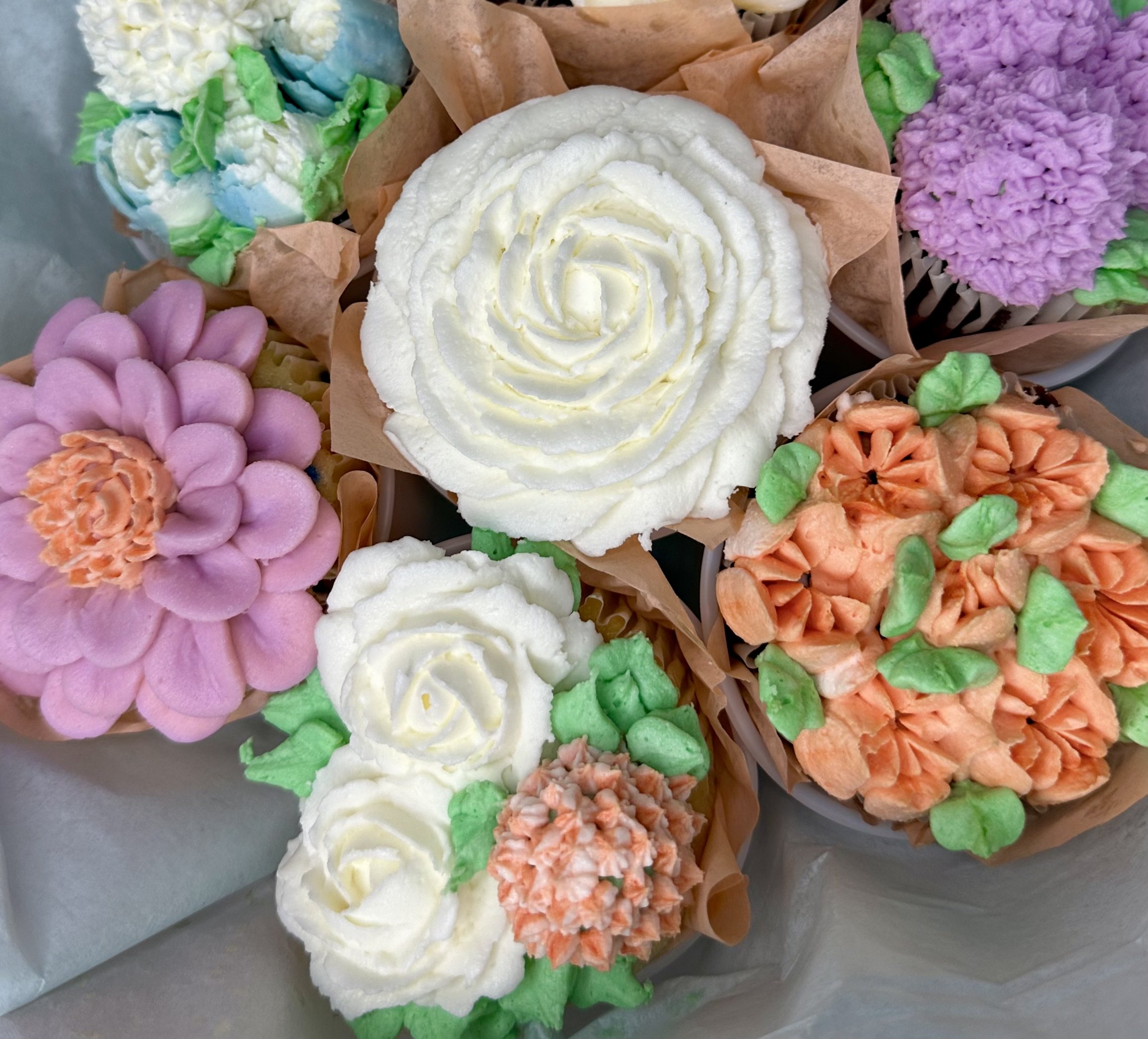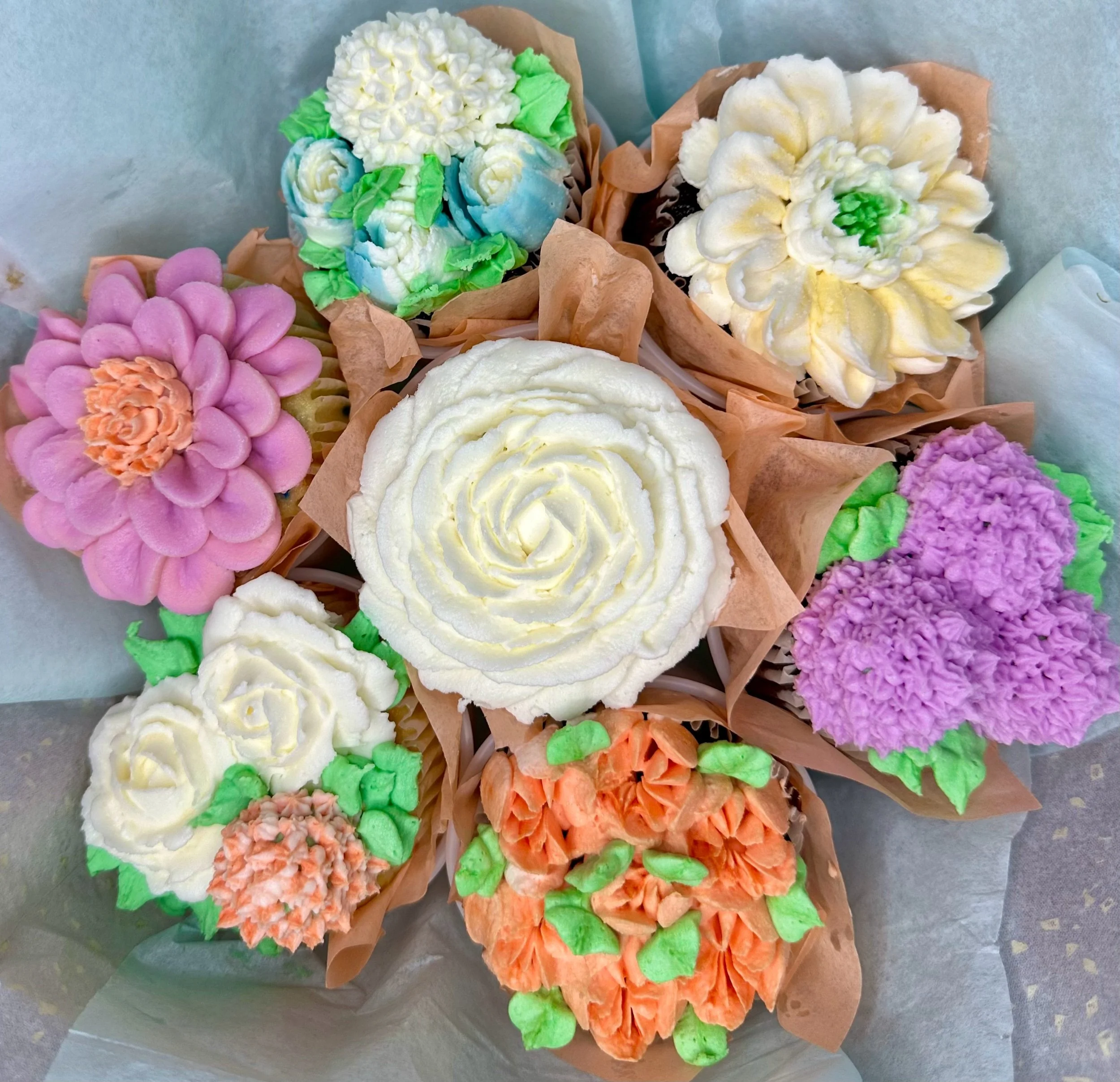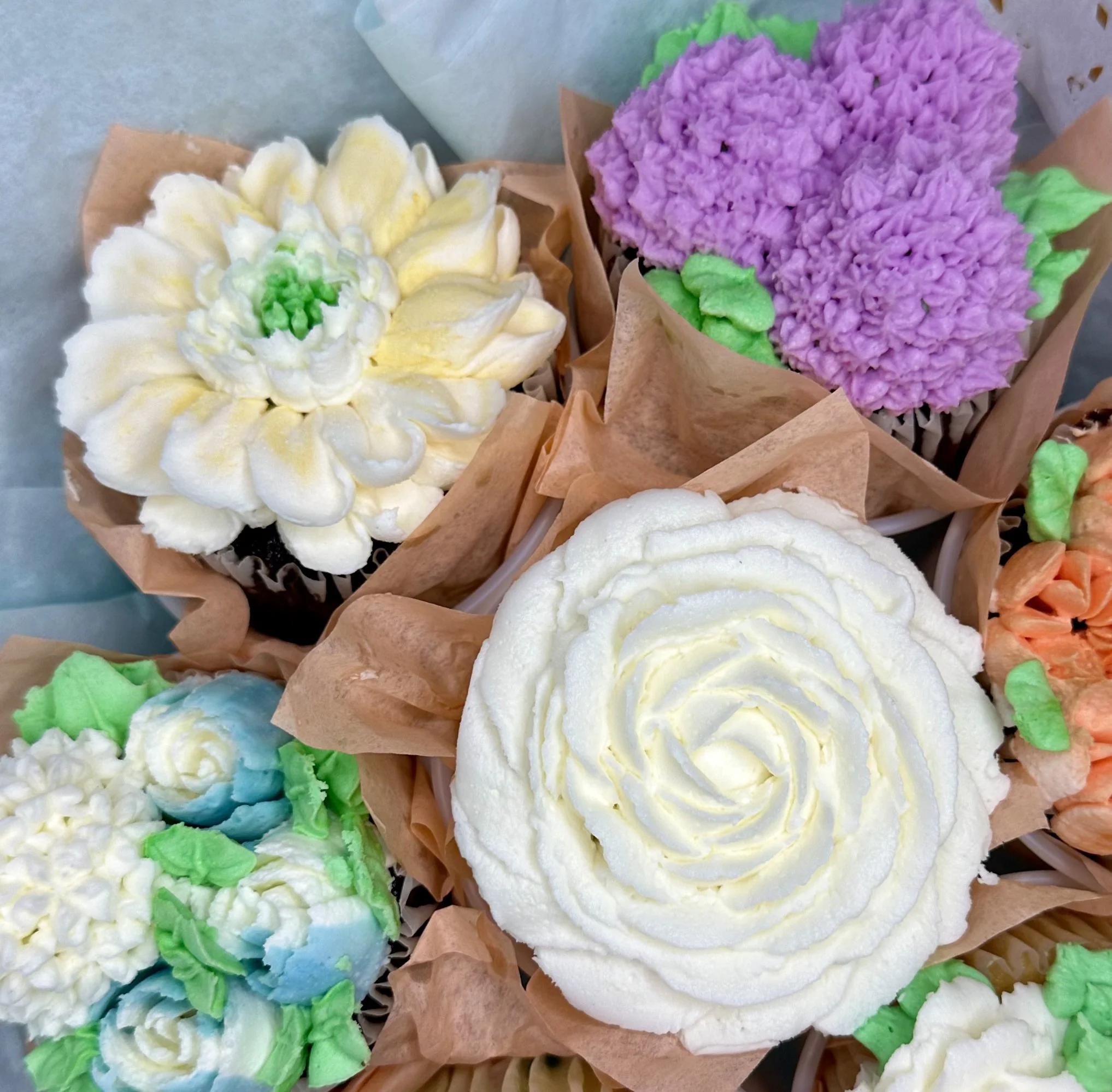 Products › Floral Cupcake Bouquet Image 1 of 4 Image 2 of 4 Image 3 of 4 Image 4 of 4 Floral Cupcake Bouquet $50.00 Handcrafted, jumbo sized vanilla cupcakes, uniquely decorated with various florals Add To Cart Added! Handcrafted, jumbo sized vanilla cupcakes, uniquely decorated with various florals